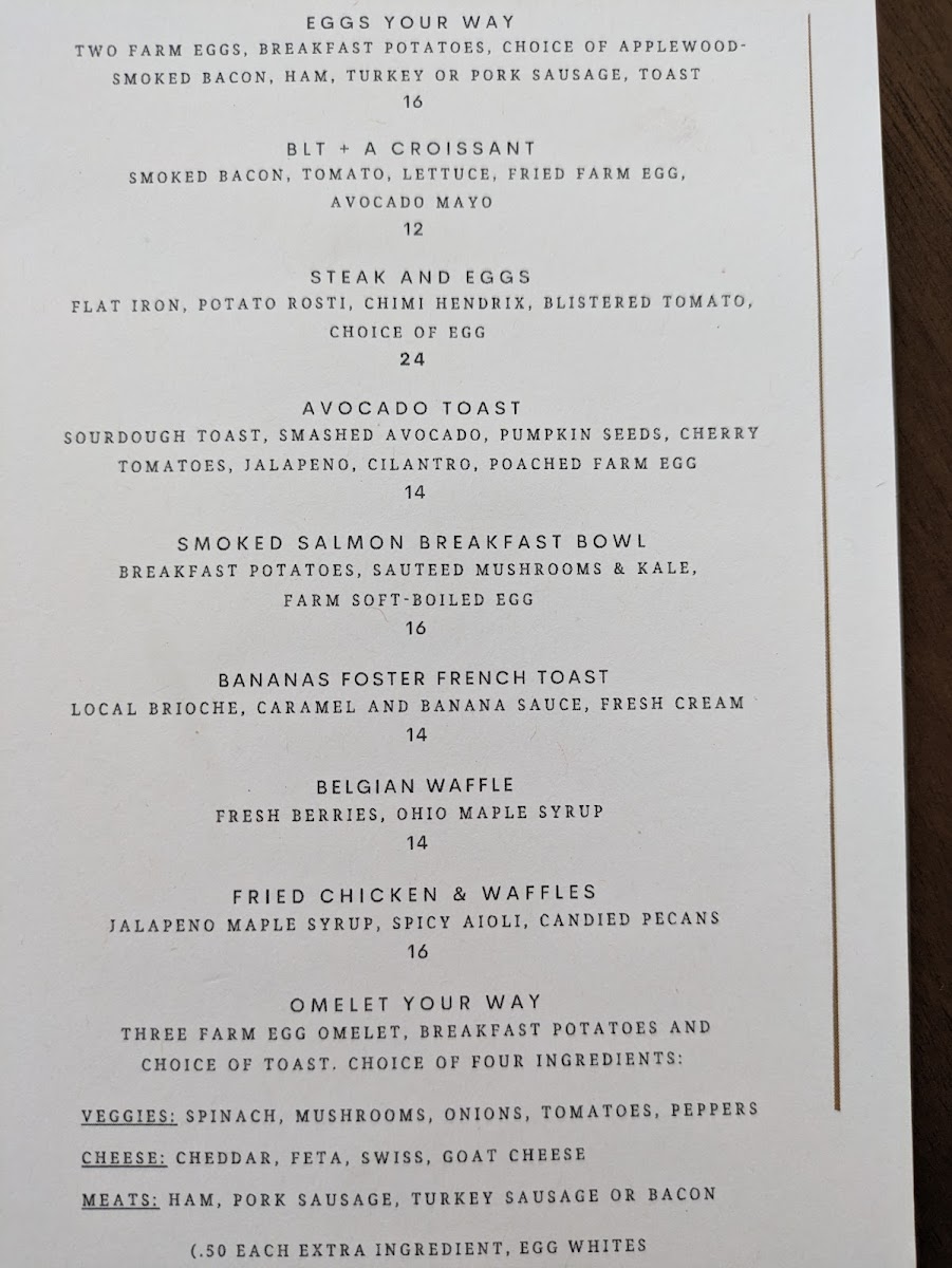 For mains, guests can savor standout dishes like the Whole Grilled Branzino, drizzled in brown butter and lemon, or indulge in the decadent Ohio Dry Aged Tomahawk steak. The wood-oven section shines with options like Roasted Cauliflower accented with harissa and toasted almonds. Desserts are not to be missed, featuring heavenly creations that promise to elevate any dining experience.